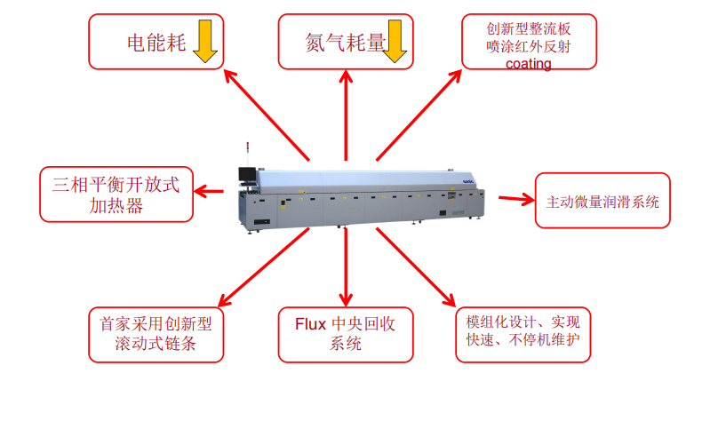 +并且加熱與熱風(fēng)系統(tǒng)均采用三相電源供電。可靠、穩(wěn)定、并極大的減少了因兩相電源不平衡問題對電網(wǎng)造成的沖擊。