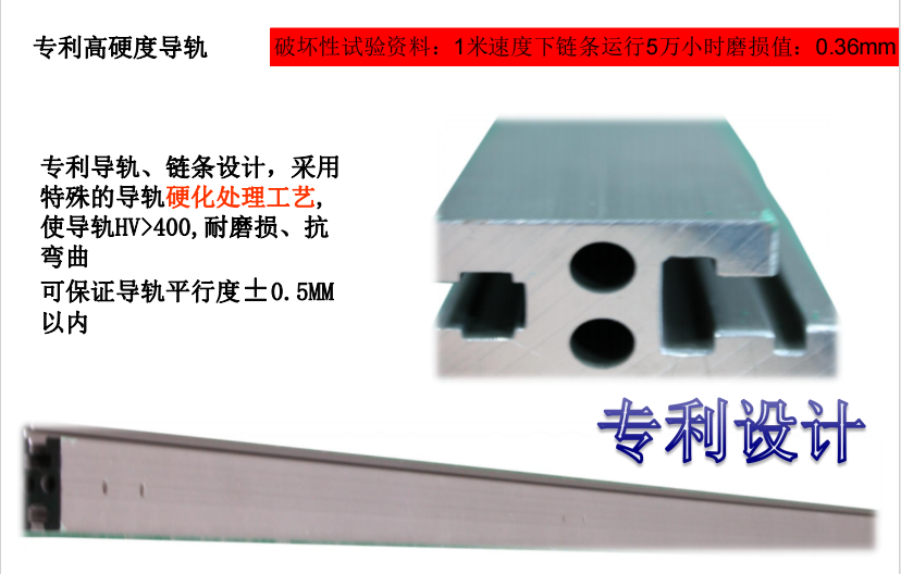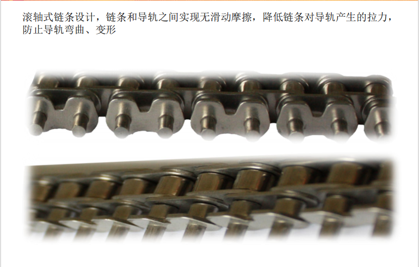+新型鏈條運(yùn)輸系統(tǒng);有效避免了因軌道與鏈條間的滑動摩擦而引起的磨損、變形、塵屑、抖動等問題。