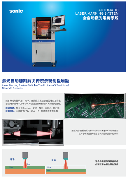 產品說明:sonic 激光打標機由深圳市新迪精密科技有限公司設計生產。主要用于 PCB、 BGA、IC 等表面雕刻 1D/2D Barcode、文字、數(shù)字、LOGO、圖形等。此設備可取代人工貼紙及噴墨等 傳統(tǒng)工藝,并且可接入 SHOPFLOW、MES、IMS 等智能生產制造系統(tǒng),進行智能化生產,符合國際智能 制造 IPC 和 HERMES 標準。此設備可 IN-LINE/OFF-LINE 自動化生產。?
