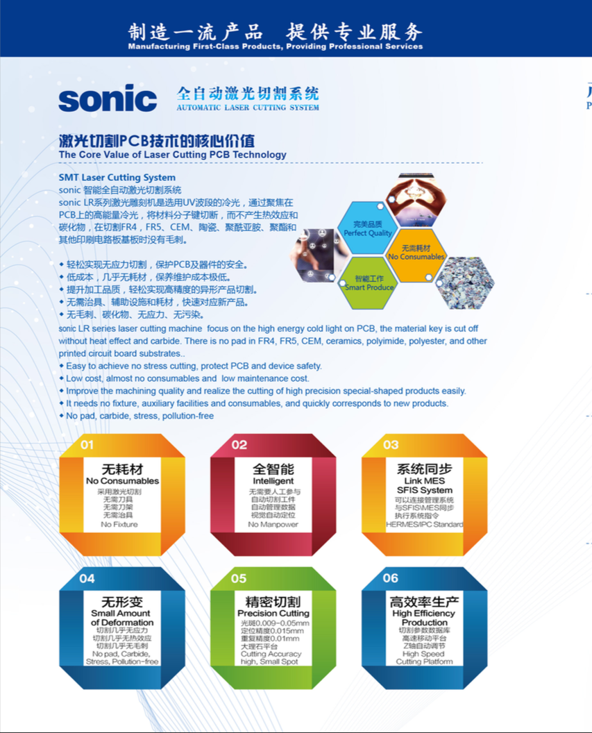 新迪sonic 激光切割機屬高精度設(shè)備,為高端客戶解決痛點,相比國內(nèi)激光設(shè)備廠商,sonic激光切割機在技術(shù)和制程上領(lǐng)先國內(nèi)廠家,設(shè)備更佳穩(wěn)定,自動化集成度更高。因為sonic激光切割機的焦點集中在SMT,PCB行業(yè),所以對行業(yè)內(nèi)激光切割的制程和技術(shù)有充分的了解和認(rèn)識,并可以給客戶帶來大廠的實際生產(chǎn)經(jīng)驗和檢驗標(biāo)準(zhǔn)。Sonic 激光切割機價格會高于國產(chǎn)激光切割設(shè)備價格,且價格低于國外進(jìn)口設(shè)備,同時可提供國內(nèi)優(yōu)質(zhì)的售后服務(wù)。